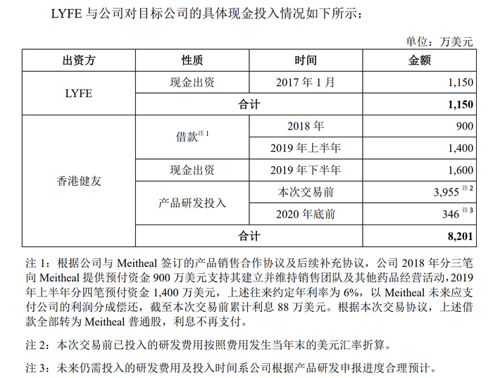 LYFE在2017年1月向Meitheal出资1150万美元。随后,LYFE再未进行过资金投入。而是由健友股份的子公司香港健友实业有限公司(以下简称香港健友)向Meitheal提供了约2300万美元的借款。