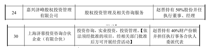 2019年4月,苑东生物(SH688513,股价30.5元,市值53.84亿元)在其招股书中披露,其董事赵晋也曾在翰尔希(北京)技术有限公司担任董事长。同时,苑东生物提供了赵晋的详细简历,赵晋在多家公司都有任职。其中,在嘉兴济峰,赵晋持有50%股份并任执行董事、经理;在上海济蓉,赵晋持有40%财产份额并担任执行事务合伙人委派代表。