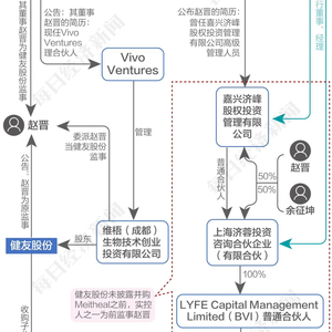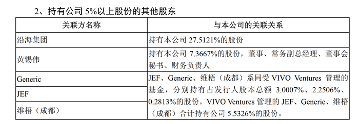 健友股份介绍,JEF、Generic、维梧(成都)系同受VIVO Ventures管理的基金,分别持有占当时健友股份股本总额3.0007%、2.2506%、0.2813%的股份。VIVO Ventures管理的JEF、Generic、维梧(成都)合计持有健友股份5.5326%的股份。
