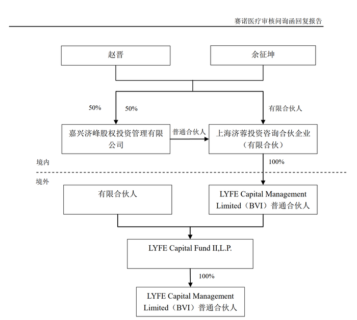 但对于普通合伙人,赛诺医疗给出了清晰的持股路径,LYFE Capital Fund II, L.P.的普通合伙人是LYFE Capital Management Limited(BVI),而这家公司受到上海济蓉投资咨询合伙企业(有限合伙)(以下简称上海济蓉)的100%控制,上海济蓉的普通合伙人是嘉兴济峰股权投资管理有限公司(以下简称嘉兴济峰)。自然人赵晋和余征坤共同控制了上海济蓉和嘉兴济峰。