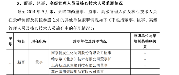 据健友股份招股书,其原监事赵晋也在翰尔希(北京)技术有限公司和上海景峰制药股份有限公司担任董事。除了这些信息之外,健友股份并未详细介绍这位前监事。