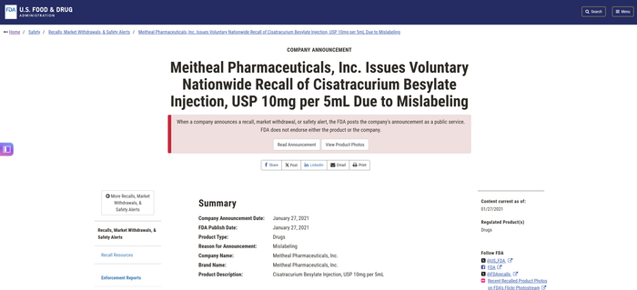 值得注意的是,Meitheal曾在美国出现过药品召回事件。FDA官网显示,2021年1月,Meitheal因药品标签出错进行了药品召回。