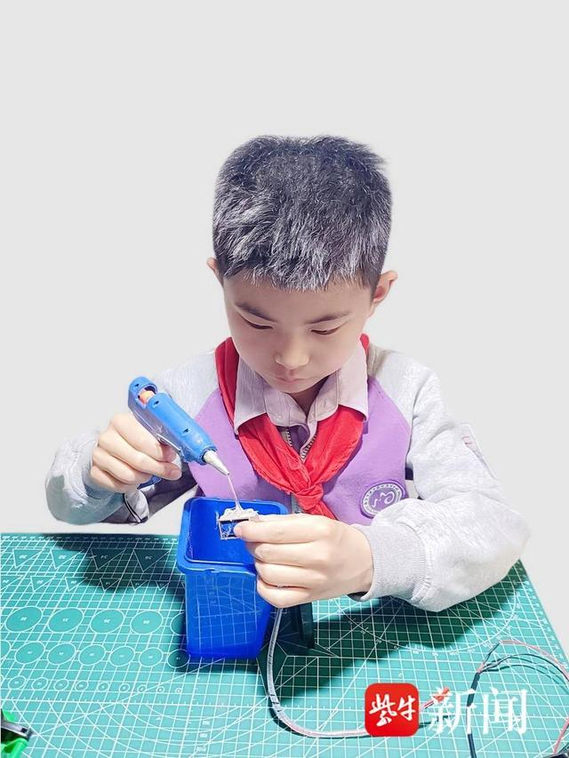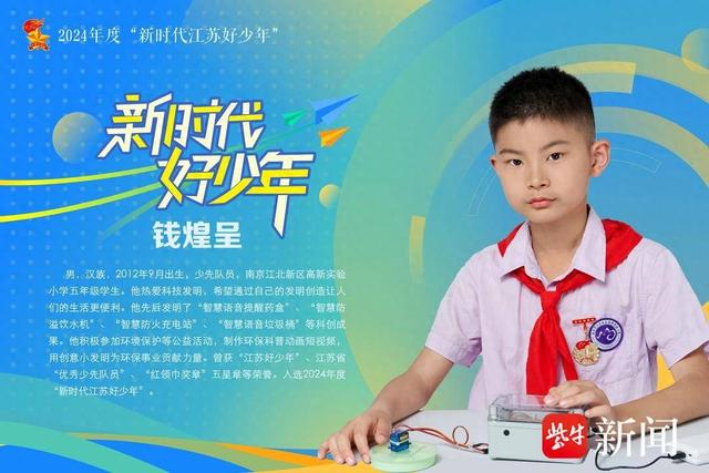 近期,江苏省精神文明建设办公室、江苏省教育厅、共青团江苏省委、江苏省妇联、江苏省关工委联合发布了2024年度“新时代江苏好少年”人选,他们品学兼优、自强不息、朝气蓬勃,这些德智体美劳全面发展的“新时代好少年”,以积极昂扬、向上向善的成长姿态,展现了新时代青少年的风貌。为了引导广大未成年人学习身边榜样,争做新时代好少年,扬子晚报特别推出2024年度“新时代江苏好少年”系列报道,一起聆听少年们的成长故事,感受榜样的力量。本期,记者采访了南京江北新区高新实验小学五年级学生钱煌呈,看他如何用“小创意”解决“大需求”。