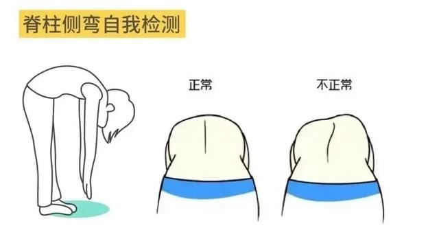 3.慢慢向前弯腰,尽量让双手触地,从后方观察背部,左右两侧肌肉是否对称(准确测量需经过X射线或CT检查后计算侧弯角度)。