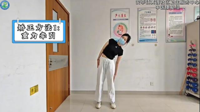 1.重力牵引:双脚分开与肩同宽,身体侧弯沿裤缝向下延伸,保持5秒,重复3-5次,如高低肩,可向高的那侧施加重力。