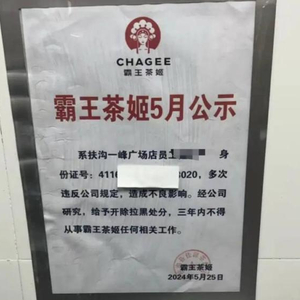7月14日,河南一女子在社交媒体发文称,自己从霸王茶姬离职后,店方在店内张贴了一张公告,公开了她的身份证号码等个人信息。