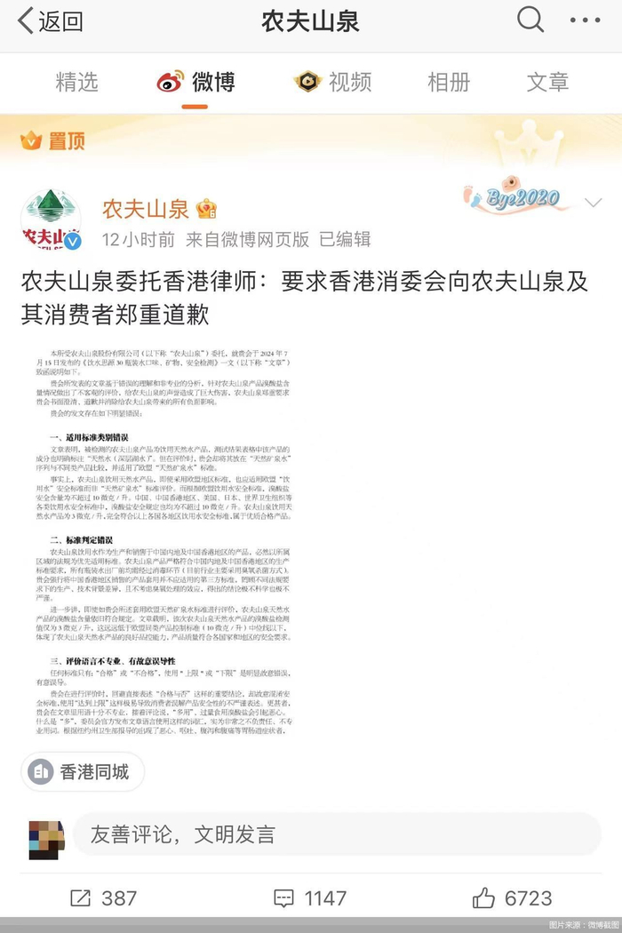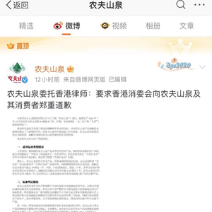 香港消委会的测试结果,受到企业的激烈反击。7月16日,农夫山泉通过公众号回应称,已委托“赵不渝马国强律师事务所”,就香港消委会发布的《饮水思源30瓶装水口味、矿物、安全检测》一文致函说明。农夫山泉方面表示,香港消委会所发表的文章基于错误的理解和非专业的分析,针对农夫山泉产品溴酸盐含量情况作出了不客观的评价,给农夫山泉的声誉造成了巨大伤害,农夫山泉郑重要求贵会书面澄清、道歉并消除给农夫山泉带来的所有负面影响。