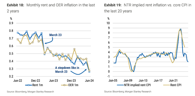 研报认为,租金通胀的“下降”使得月度租金数据回到了类似于疫情前的水平。虽然这花了很长时间,但6月租金通胀的下降如果能持续下去,每月可以将核心CPI路径比最近的趋势减少6个基点,而大摩认为这种可能性很大。而且如果根据新租户租金指数(NTR)及其四个季度的领先指标,租金CPI在未来几个月可能会进一步下降。
