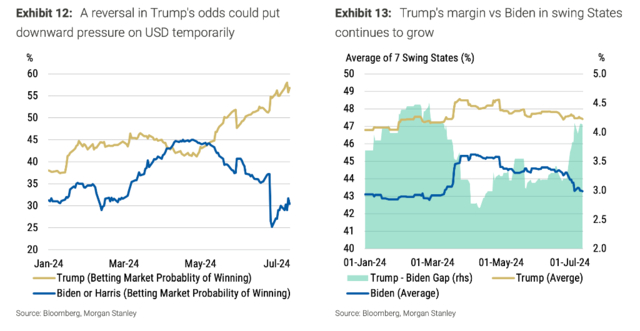 但大摩也指出,随着选举临近,市场可能会考虑在特朗普总统领导下共和党全面胜利情况下通胀上升的可能性。目前,前总统特朗普在2024年11月总统选举中获胜的几率接近60%。