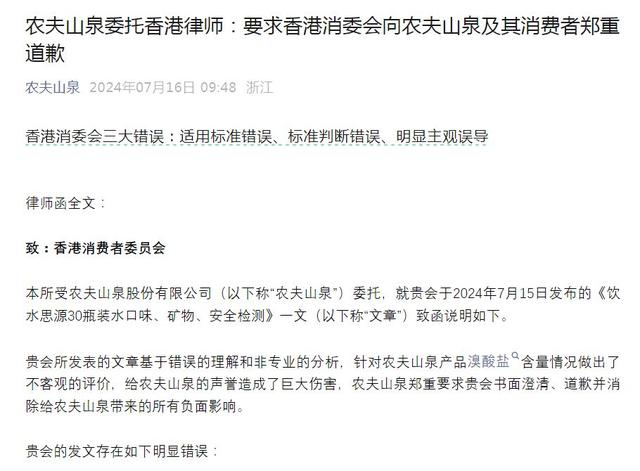 16日,农夫山泉在官方微信公众号发布致香港消委会律师函,指出香港消委会三大错误:适用标准错误、标准判断错误、明显主观误导,并请香港消委会立即作出澄清、道歉并消除影响。