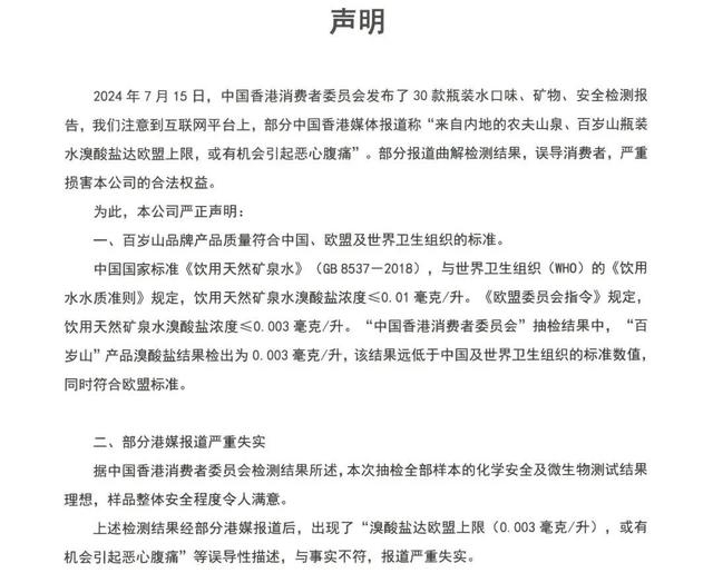 16日,百岁山在官方微信公众号发表声明称:“2024年7月15日,中国香港消费者委员会发布了30款瓶装水口味、矿物、安全检测报告,我们注意到互联网平台上,部分中国香港媒体报道称‘来自内地的农夫山泉、百岁山瓶装水溴酸盐达欧盟上限,或有机会引起恶心腹痛’。部分报道曲解检测结果,误导消费者,严重损害本公司的合法权益。”