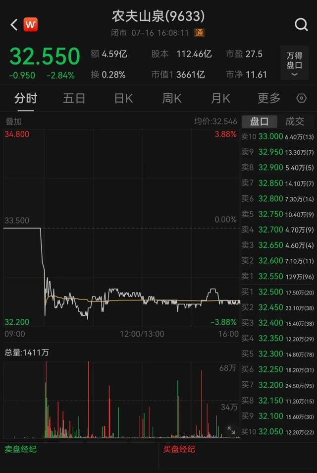 16日,截止收盘,农夫山泉股价为32.55港元/股,创下45个月以来新低,总市值为3661亿港元。