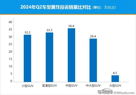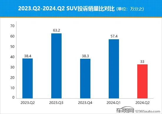 据国内领先的缺陷汽车产品信息收集平台车质网数据显示,2024年二季度共受理国内SUV投诉量累计为13,694宗,乘联会数据显示同期国内SUV(除进口车)销量约为243.3万辆,涵盖330款车型。为确保数据的准确性,车质网本次只统计这330款车型的首次投诉案例,计算得出2024年二季度SUV投诉销量比均值为万分之33,较一季度万分之57.4的均值有明显降低,整体投诉销量比表现呈现出转好迹象。
