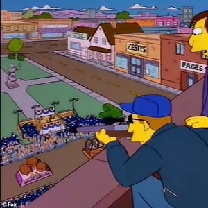 在这部动画片1996年首播的一集里,故事讲述了主角之一的丽莎·辛普森偶然发现,她生活的小镇其实由一名善于欺骗他人的海盗建立。在故事中,其中一幕是一名射手趴在屋顶,在另一人的指挥下向演讲台射击(见上图)。