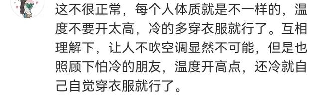 每次我开空调,还要阴阳我说年轻就是火气大。我真的是无语,三伏天开28度还冷,到底是什么体质啊!!!我有时候觉得冷,就自己披个小毛毯啊,老要求别人干吗啊,现在还不开空调不是与自然为敌吗?现在有时候搞得我都觉得是不是我的问题了。