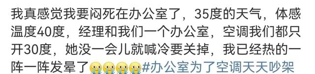 一早上从地铁站到公司真的很热,到办公室就开了空调。刚打开就有人开始说了温度开高点。开了个会回办公室,发现空调不知道又被谁关了,今天最高气温37度啊,热都热死了!我说要把空调调低一点点,一直开的最低速,还说冷冷冷。