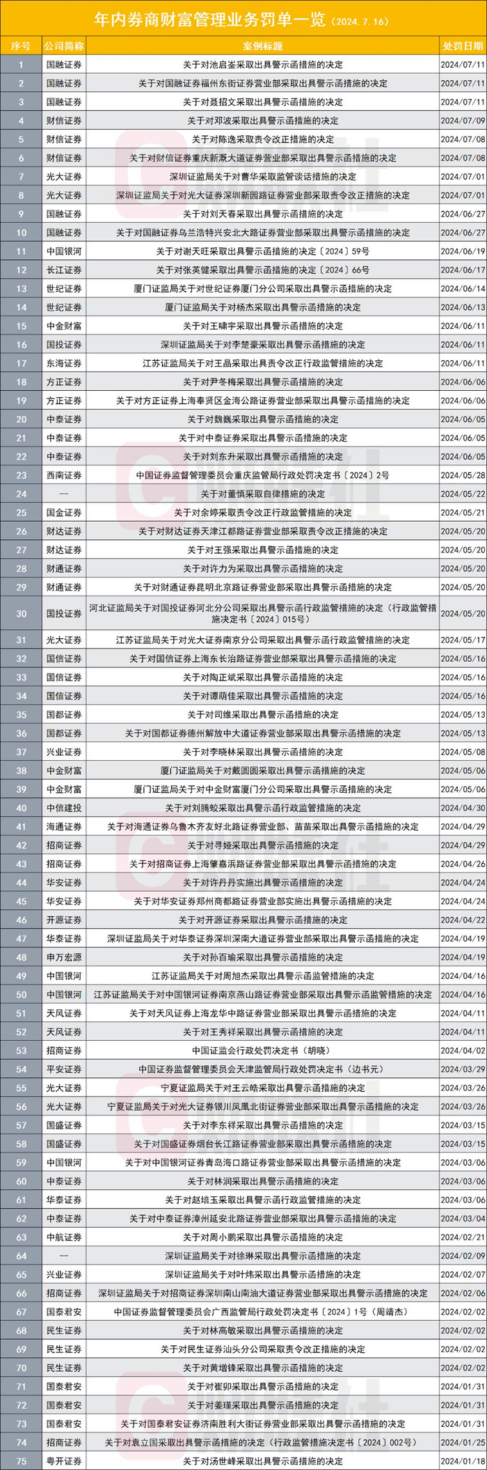 19家券商营业部被罚:包括国融证券福州东街证券营业部、财信证券重庆新溉大道证券营业部、光大证券深圳新园路证券营业部、国融证券乌兰浩特兴安北大路证券营业部、方正证券上海奉贤区金海公路证券营业部、财达证券天津江都路证券营业部、财通证券昆明北京路证券营业部、国信证券上海东长治路证券营业部、国都证券德州解放中大道证券营业部、海通证券乌鲁木齐友好北路证券营业部、招商证券上海肇嘉浜路证券营业部、华安证券郑州商都路证券营业部、华泰证券深圳深南大道证券营业部、中国银河证券南京燕山路证券营业部、天风证券上海龙华中路证券营业部、中国银河证券青岛海口路证券营业部、中泰证券漳州延安北路证券营业部、招商证券深圳南山南油大道证券营业部、国泰君安证券济南胜利大街证券营业部。