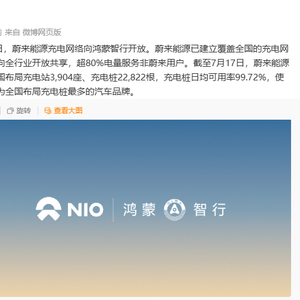 7月17日,蔚来在官微上宣布,蔚来能源与华为鸿蒙智行达成服务合作,蔚来能源充电网络将向鸿蒙智行品牌车型(包括问界、智界、享界等)开放。