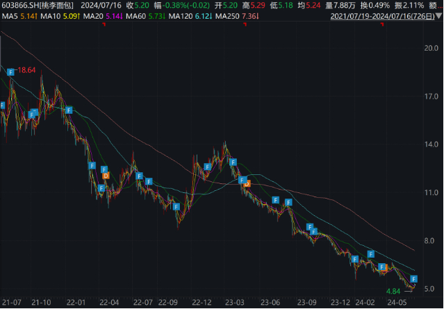 从二级市场来看,自2023年3月起,桃李面包股价便持续下跌,市值较巅峰期缩水已超百亿。