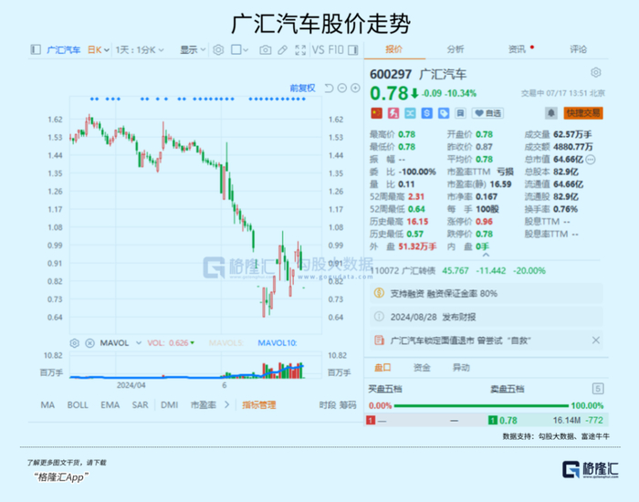 自6月20日收盘价降至0.98元/股,广汇汽车股价已连续20个交易日低于1元。