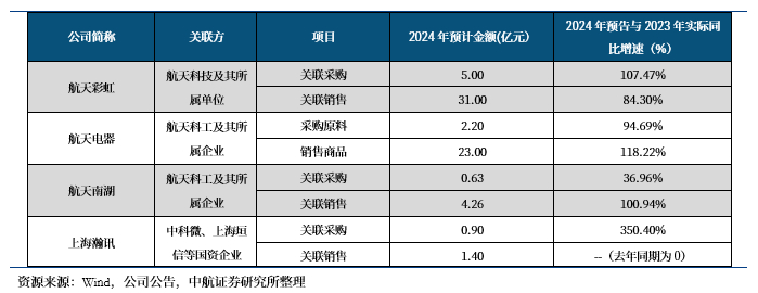 航天央企下属上市企业公告关联交易时常作为业绩预测指标,预计关联交易的增速如果与预期出现偏差,也将影响股价表现。根据我们统计的多个航天央企下属上市企业的关联采购以及关联销售数据来看,2024年,多家航天企业对其相关领域下游需求信心仍足。