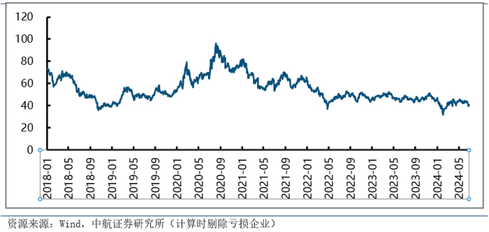 我们对中航证券航天行业指数标的进行PE(TTM)统计,截至2024年6月末,指数市盈率为40.83倍,较5月底下降3.21,处于2018年以来的5.23%分位。
