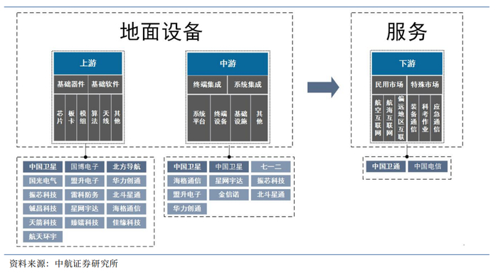 卫星通信应用产业链主要为地面设备和运营商构成,相关上市公司分布情况如下图所示。