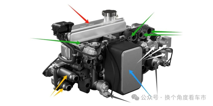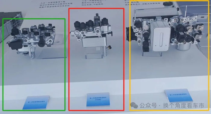 上图由左向右分别是用于电动车型的代一体化热管理系统、用于混动车型1代一体化热管理系统,用于EV车型的“16合1”一体化热管理系统(2代),不断强化集成度的同时,主打分配冷量和热量的流向更丰富,满足更多分系统精准温控需求。