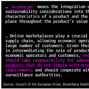 (彭博行业研究)——即将出台的欧盟生态设计法规恐将推升Zalando和Asos等电商公司的合规成本。许多平台都鼓励商家公布所售产品的可持续属性,但"漂绿"问题值得警惕。提高供应链透明度可能有助于强化绿色主张,但平台需要对供应商进行严格的审查和审计。