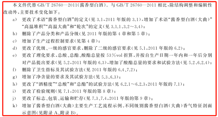 与现行GB/T 26760-2011《酱香型白酒》相比,新标准GB/T 10781.4-2024对酱香白酒的标准进行多项修改,包括标准名称、酱香型白酒定义、产品分类、产品分级、生产过程要求、感官要求、理化要求、卫生指标等。
