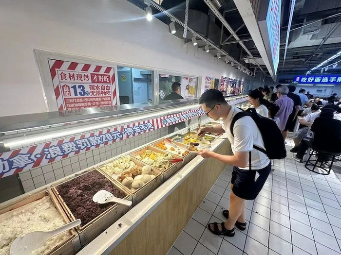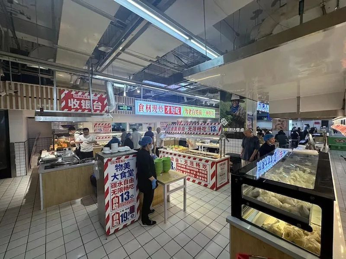 7月17日,第一财经记者在北京中关村物美门店“物美大食堂”看到,该食堂位于超市的熟食区,分成13元和19元两个区域,进场需要交5元的押金,离开时退还。