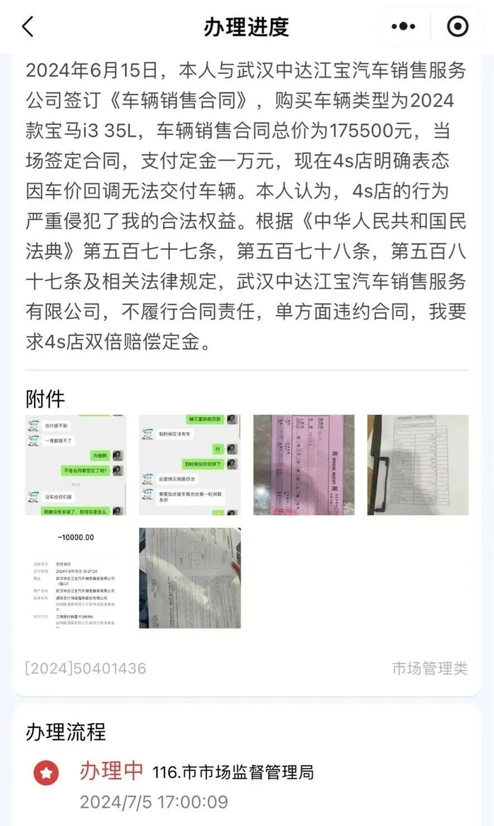 一位来自武汉的宝马准车主,也遇到类似情况,他晒出的图片显示: