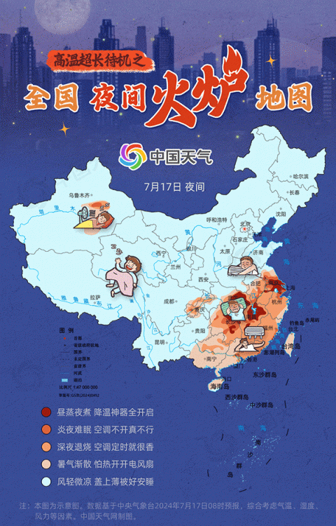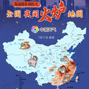 最近几天,我国南方地区高温正盛,白天热量炙烤大地,夜晚暑热继续控场,一些地方深夜还能维持在30℃以上,网友纷纷吐槽“出门一趟像洗了衣服”、“早上清蒸、中午爆炒、晚上红烧”……未来一周(7月17日至23日),南方的高温将持续打卡,18日之后,闷热范围还会不断扩大,从华北到华南将一同“蒸桑拿”。中国天气网推出全国夜间火炉地图,看看哪里昼蒸夜煮难入睡。