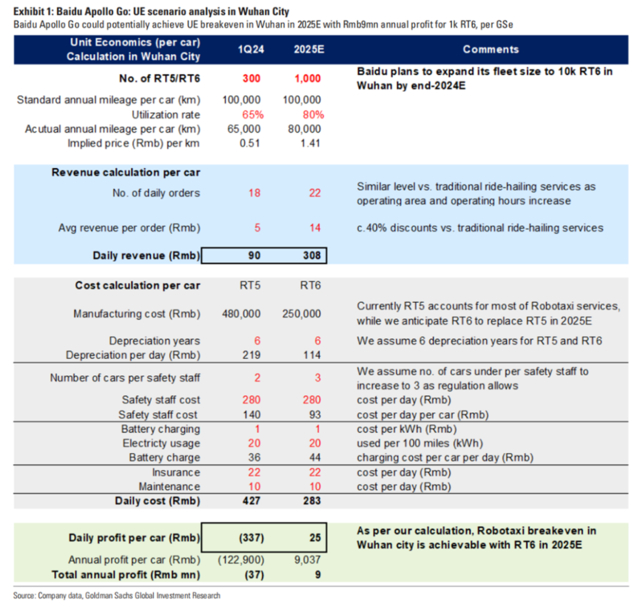 先上高盛的结论:百度的目标是将其在武汉的车队规模扩大到1000辆RT6(颐驰 06),并预计未来2-3个季度,萝卜快跑业务将在在武汉实现单位经济效益盈亏平衡,在2025年实现盈利。