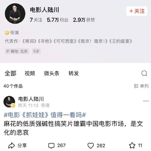 7月16日,电影导演陆川点评《抓娃娃》“麻花的低质强碱性搞笑片雄霸中国电影市场,是文化的悲哀”,目前该内容已经删除。