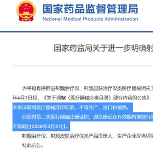 为了整治行业乱象,2022年3月30日,国家药监局发布了关于调整《医疗器械分类目录》部分内容的公告(下称“30号公告”),明确将射频美容仪纳入第三类医疗器械监管,自2024年4月1日起,未依法取得医疗器械注册证的射频治疗仪、射频皮肤治疗仪类产品不得生产、进口和销售。