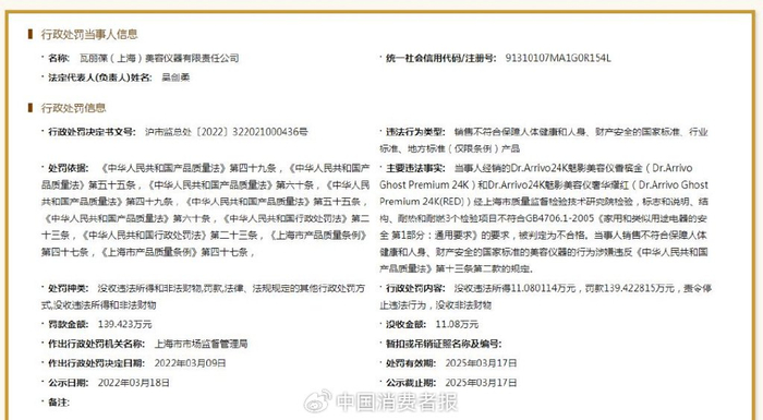 瓦丽葆(上海)美容仪器有限责任公司因销售不符合保障人体健康和人身、财产安全标准的Dr.Arrivo品牌系列中的24K魅影美容仪,被罚没款共计150万余元。