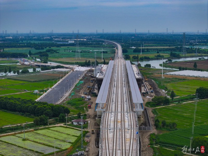 2024年7月9日,建设者在沪苏湖高铁练塘站施工。目前,沪苏湖高铁练塘站主体工程全部建成,现正在进行内部装修和外立面收尾工作。记者张海峰摄