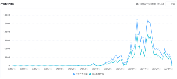 根据有米云数据,从3月到现在,豆包的每日广告创意数量最高点为12000+个,是Kimi最高点(6000+个)的2倍,是智谱的最高水准(3000+个)的4倍。