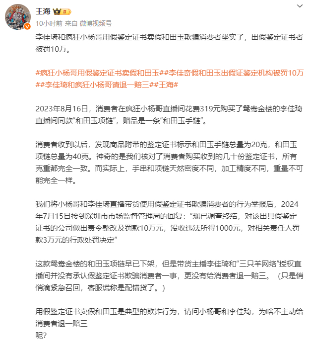 打假人@王海 发文称:李佳琦和疯狂小杨哥用假鉴定证书卖假和田玉欺骗消费者坐实了,出假鉴定证书者被罚10万元。
