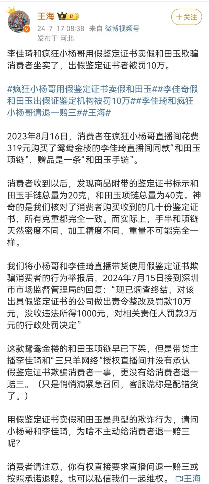 7月17日午间消息,打假人王海发微博称,“李佳琦和疯狂小杨哥用假鉴定证书卖假和田玉欺骗消费者,出假鉴定证书者被罚10万。”