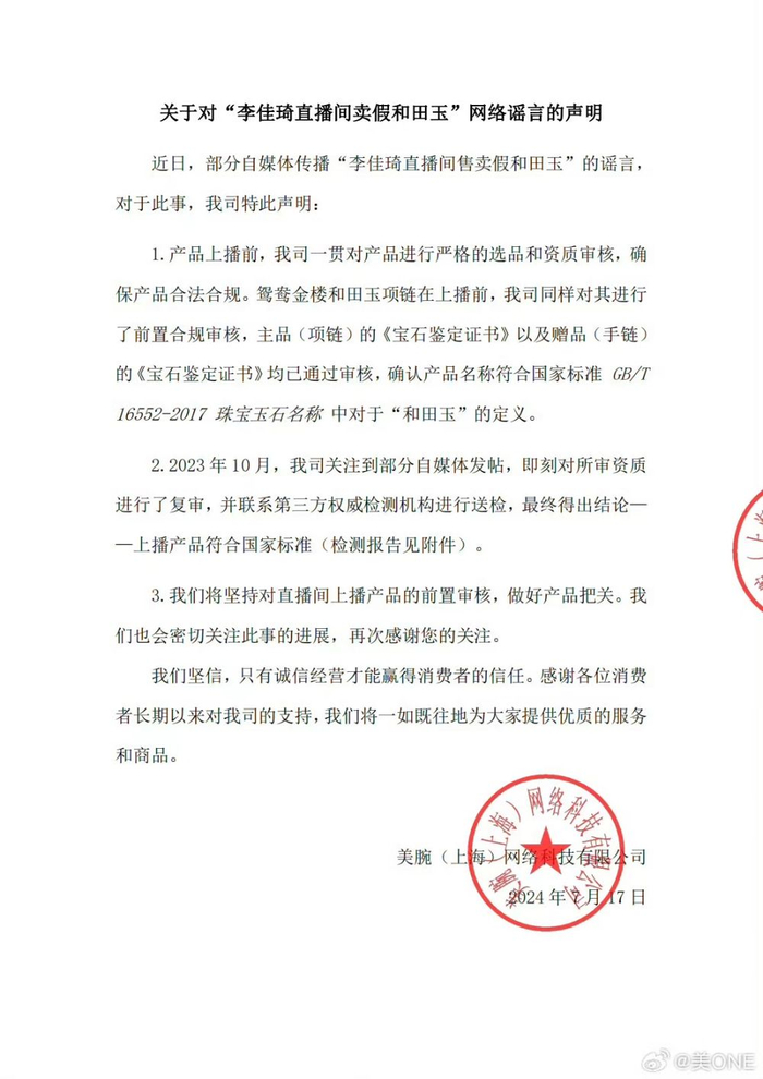 7月17日晚间,@美ONE 发布关于对“李佳琦直播间卖假和田玉”网络谣言的声明。