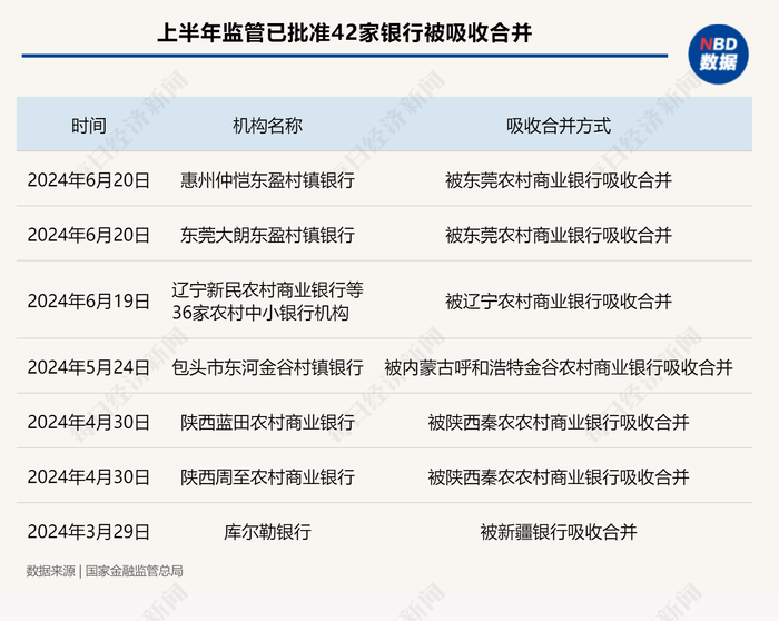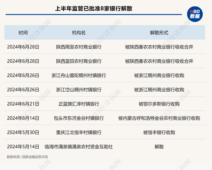 根据《每日经济新闻》记者不完全统计,今年上半年,就农村中小金融机构而言,国家金融监管总局共发布了8家机构解散批复、8家机构收购批复和42家机构吸收合并批复。