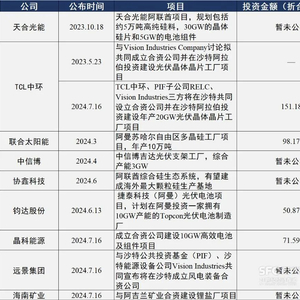 天合光能的合作方包括AD Ports Company PJSC、江苏省海外合作投资有限公司,规划在阿联酋的哈里发经济区内建设30GW硅片产能项目。TCL中环的合作方则为Vision Industries Company、沙特阿拉伯公共投资基金(PIF),三方将成立合资公司建设年产20GW硅片工厂,总投资约20.8亿美元。