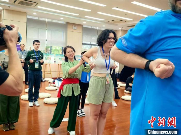 当日,在上海传承导引医学研究所的严石卿家庭带领下,中外营员们凝神定气,打起了易筋经功法。动静之间,青年们在舒缓延绵的动作中感悟中华养生的内涵。刚刚做完易筋经功法的突尼斯女孩 Yosr Fourati说,感觉身体轻快,很放松。