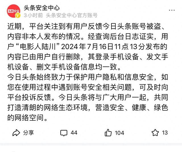头条安全中心回应:“电影人陆川”发文删文手机设备一致。