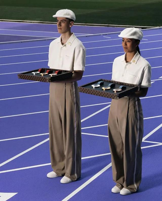 志愿者颁奖礼服也由LV提供,白色Polo衫、贝雷帽,搭配米色长裤,中性风的复古设计,高度还原了上世纪20年代巴黎奥运会的风格。此次LV一共设计了600套礼服,供515名颁奖志愿者在仪式上穿着。