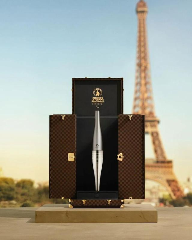 盛放火炬的行李箱设计也应用了LV棋盘格的经典元素,非常抢眼。每个行李箱的底座和盖子上都有圆形的“插座”,火炬被安装并精准地固定到位,内部采用柔软的黑色亚光皮革,只需要将其反转,就可以露出浮雕设计的2024年巴黎奥运会标志,让火炬行李箱轻松变身为优雅的展示柜。