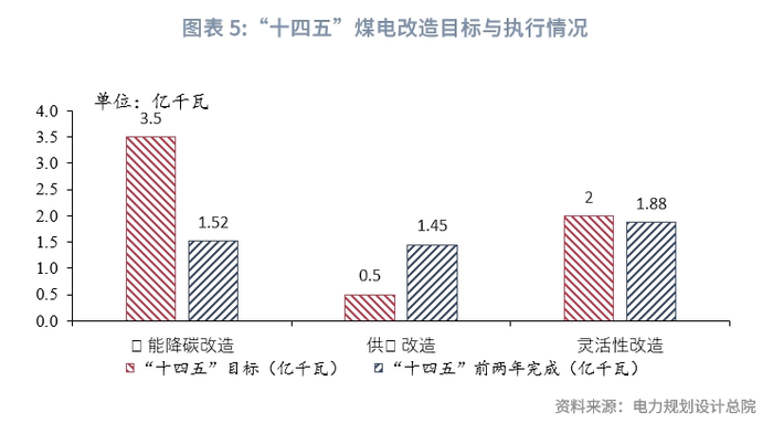 以鼓励原则选择低碳化改造机组。《行动方案》首先明确实施低碳化改造建设的存量煤电机组应“预期剩余使用寿命长、综合经济性好”,而新增机组应为“纳入国家规划内建设项目”。针对已经实施低碳改造建设的机组、承担技术攻关任务、“两个联营”以及新能源大基地配套机组,实施低碳化改造建设工作均持鼓励非强制态度。近年来,“三改联动”一直是煤电转型路径的主旋律,根据《国家发展改革委 国家能源局关于开展全国煤电机组改造升级的通知》(发改运行〔2021〕1519号),预计“十四五”期间,煤电节能降碳改造规模不低于3.5亿千瓦、供热改造规模力争达到5000万千瓦、灵活性改造完成2亿千瓦。由电力规划设计总院发布的《中国电力发展报告2023》显示,“十四五”前两年,煤电“三改联动”改造规模合计超过4.85亿千瓦,完成“十四五”目标的约81%。其中,节能降碳改造1.52亿千瓦,灵活性改造1.88亿千瓦,供热改造1.45亿千瓦。针对煤电低碳化改造建设,采取非强制性措施,将显著降低煤电企业压力,提高煤电企业自主选择积极性。