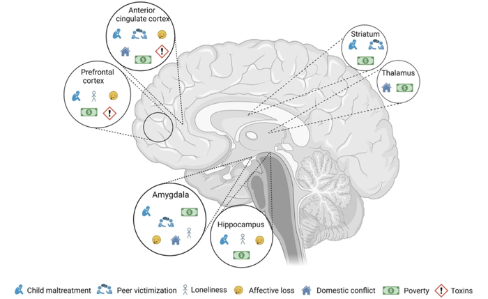事实上,无论是童年虐待,还是同伴霸凌、社会孤立、情感损失、家庭冲突、贫穷或是环境毒素,每一种形式的“逆境与磨难”都会在大脑中留下痕迹,并影响多个大脑区域。而反复或者同时发生的多种逆境又会加剧损害,从而对特定脑区的神经生物学产生累积性影响。
